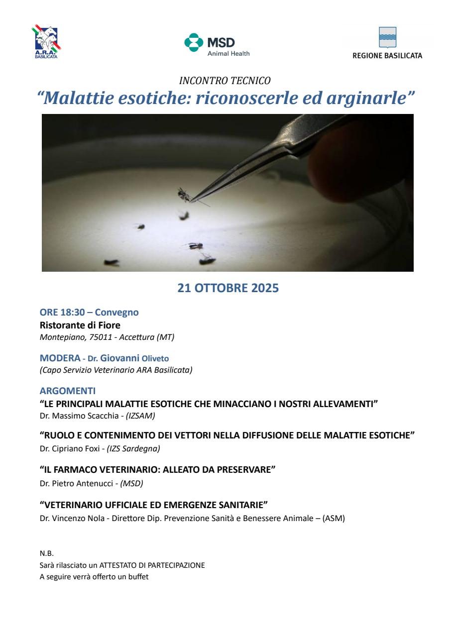 ARA Basilicata organizza un incontro tecnico "Malattie esotiche: riconoscerle ed arginarle" per il 21/10/2025 presso Ristorante di Fiore - Montepiano - 75011 - Accettura (MT)