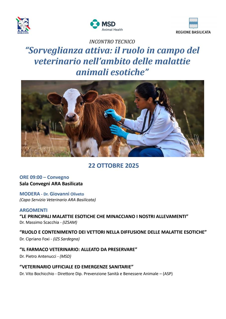 ARA Basilicata organizza un incontro tecnico "Sorveglianza attiva: il ruolo in campo del veterinario nell’ambito delle malattie animali esotiche" per il 22/10/2025 presso la Sala Convegni dell'ARA Basilicata - sede di Potenza