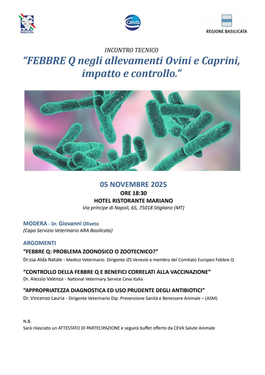 ARA Basilicata organizza un incontro tecnico "FEBBRE Q negli allevamenti Ovini e Caprini, impatto e controllo" per il 05/11/2025 presso HOTEL RISTORANTE MARIANO – Stigliano (MT)
