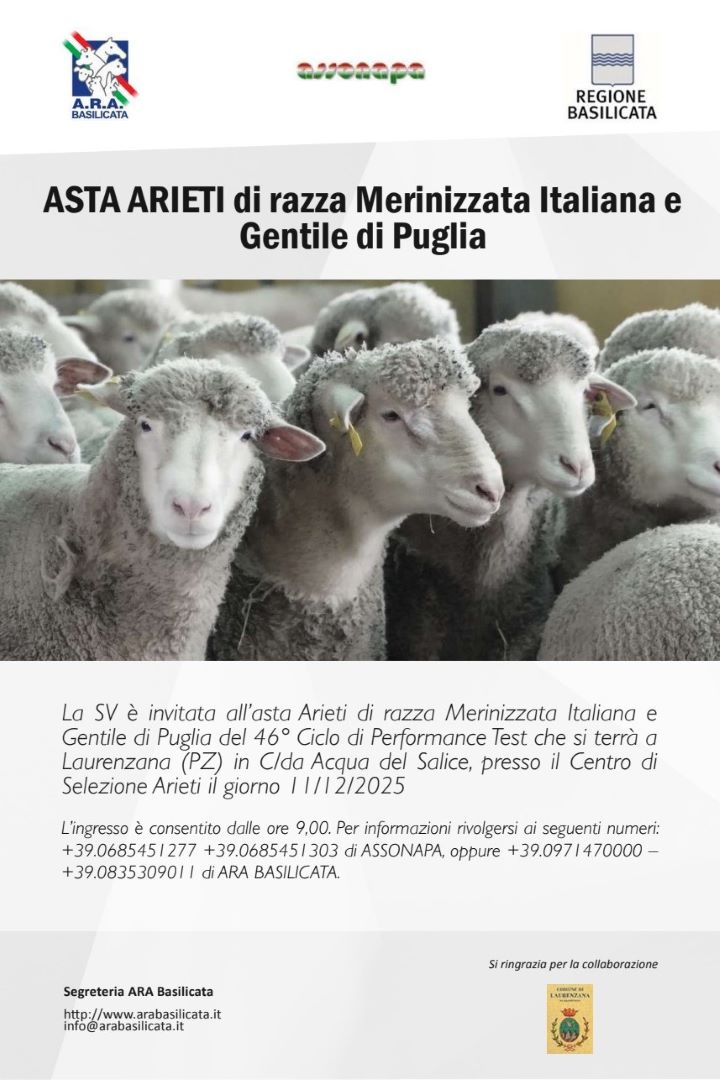 Giovedì 11 Dicembre 2025 alle ore 9:00 si terrà l'ASTA ARIETI di razza Merinizzata Italiana e Gentile di Puglia del 46° Ciclo di Performance Test, organizzata da ASSONAPA e ARA Basilicata presso il Centro di Selezione Arieti a Laurenzana (PZ).
