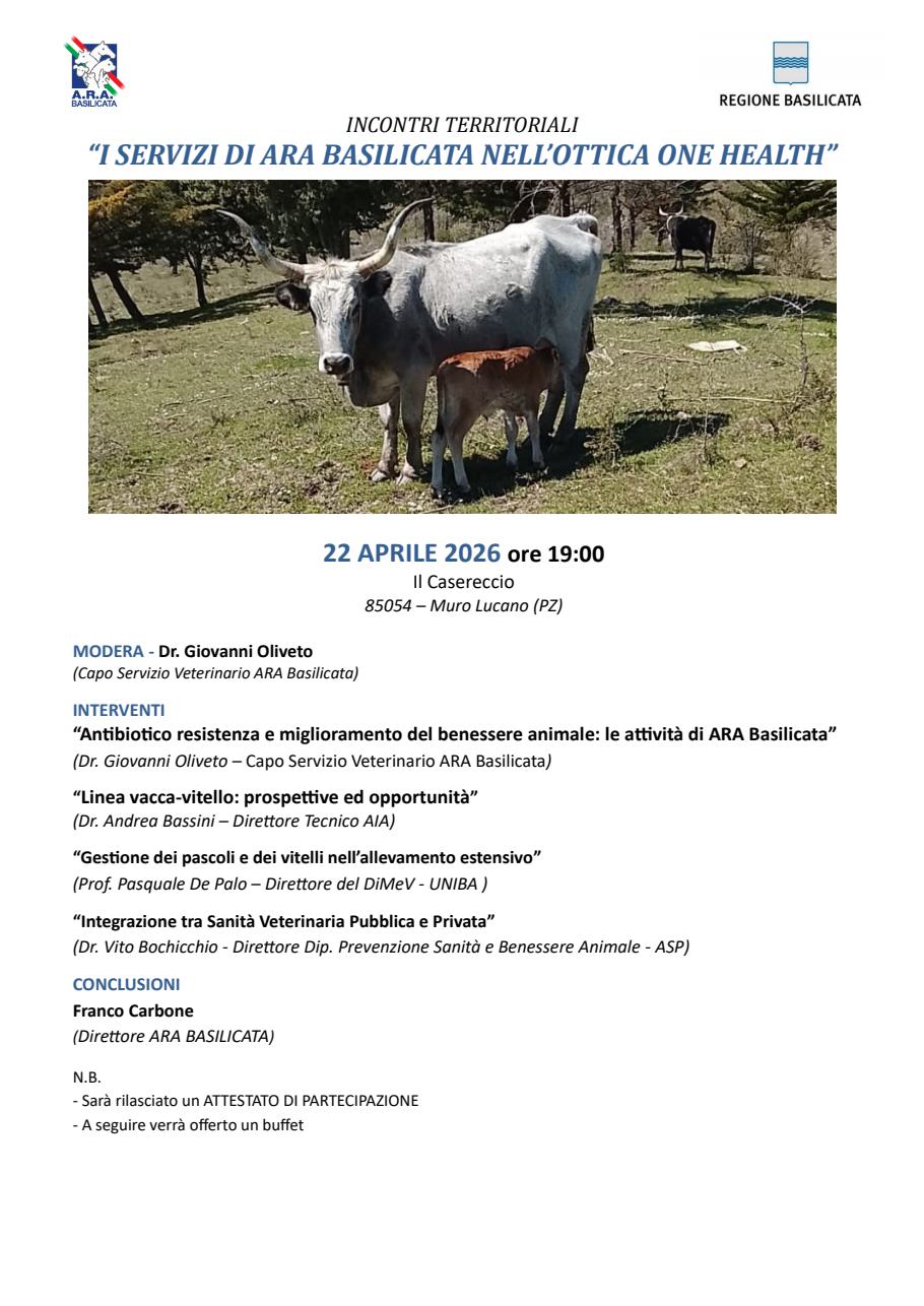 ARA Basilicata organizza un incontro territoriale dal titolo "I SERVIZI DI ARA BASILICATA NELL’OTTICA ONE HEALTH" per il 22/04/2026 presso Il Casereccio – Muro Lucano (PZ)