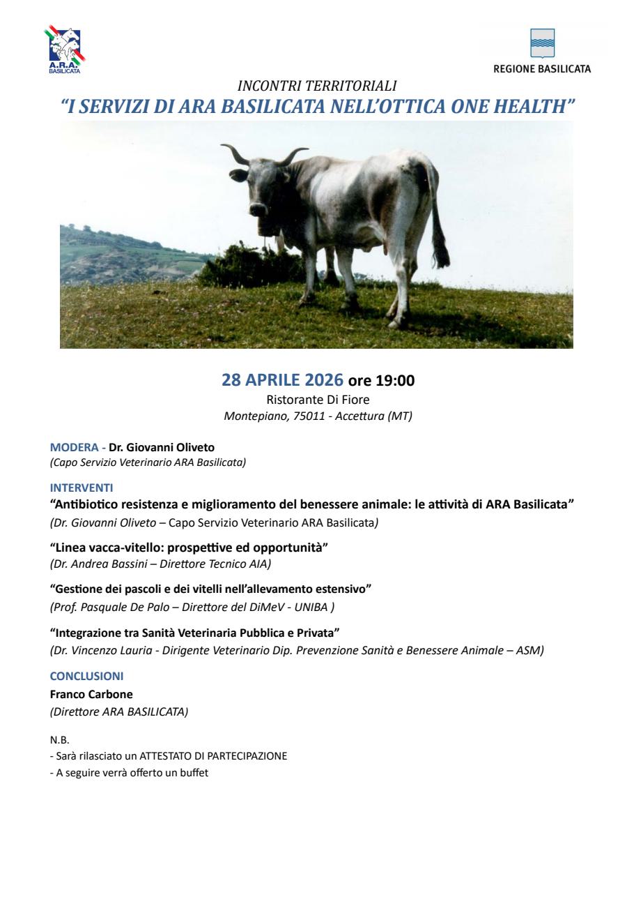 ARA Basilicata organizza un incontro territoriale dal titolo "I SERVIZI DI ARA BASILICATA NELL’OTTICA ONE HEALTH" per il 28/04/2026 presso Ristorante Di Fiore - Montepiano, 75011 - Accettura (MT)